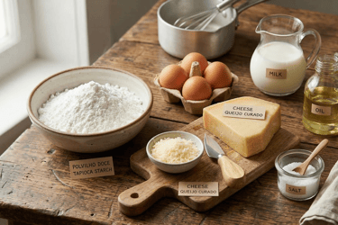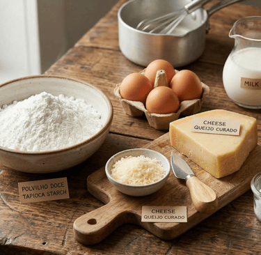While the traditional Queijo de Minas is hard to find abroad, a professional substitute is a mix of Pecorino Romano (for salinity) and Aged White Cheddar (for fat content and melt). The cheese should be finely grated so it distributes evenly through the starch matrix, ensuring every bite has a "velvety" cheese pull.